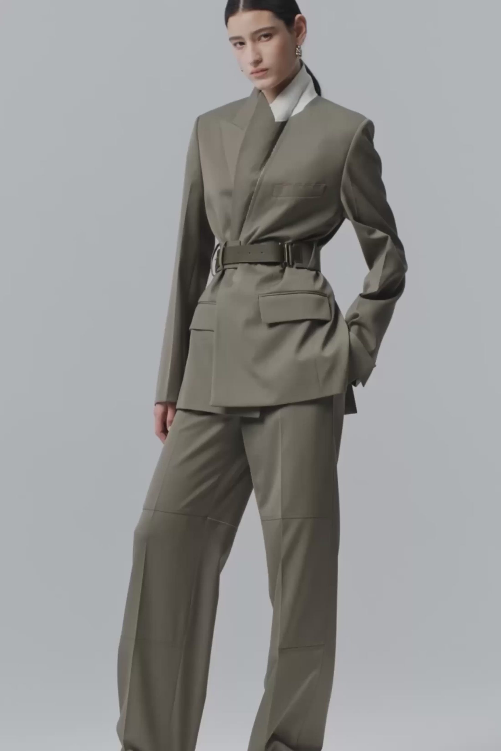 Crisp tailoring is a hallmark of the Victoria Beckham brand and the wool-blend Belted Tailored Jacket in Sage Melange brings a fresh perspective to the house’s edit. Finishing below the hip, it has double back vents, front welt pockets with flaps and a single chest welt pocket. Distinguished by a B belt trim, it exudes modern sophistication.