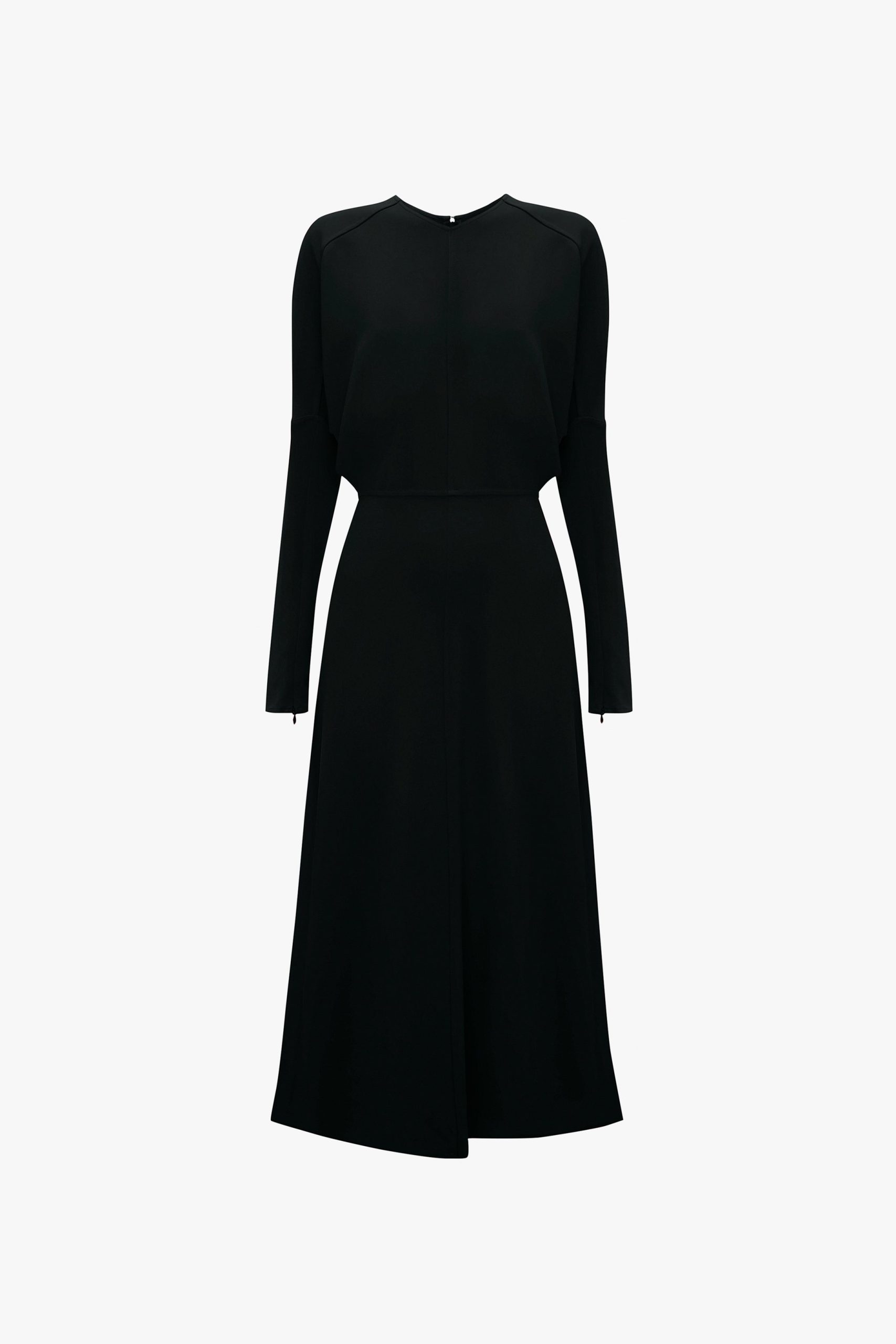 Cut from fluid, mid-weight cady in inky black, the Dolman Midi Dress exudes off-duty ease. The voluminous, draped shoulders bring a sense of softness and movement, while the fitted waist and narrow sleeves bring a structure that looks elegant both day and night.