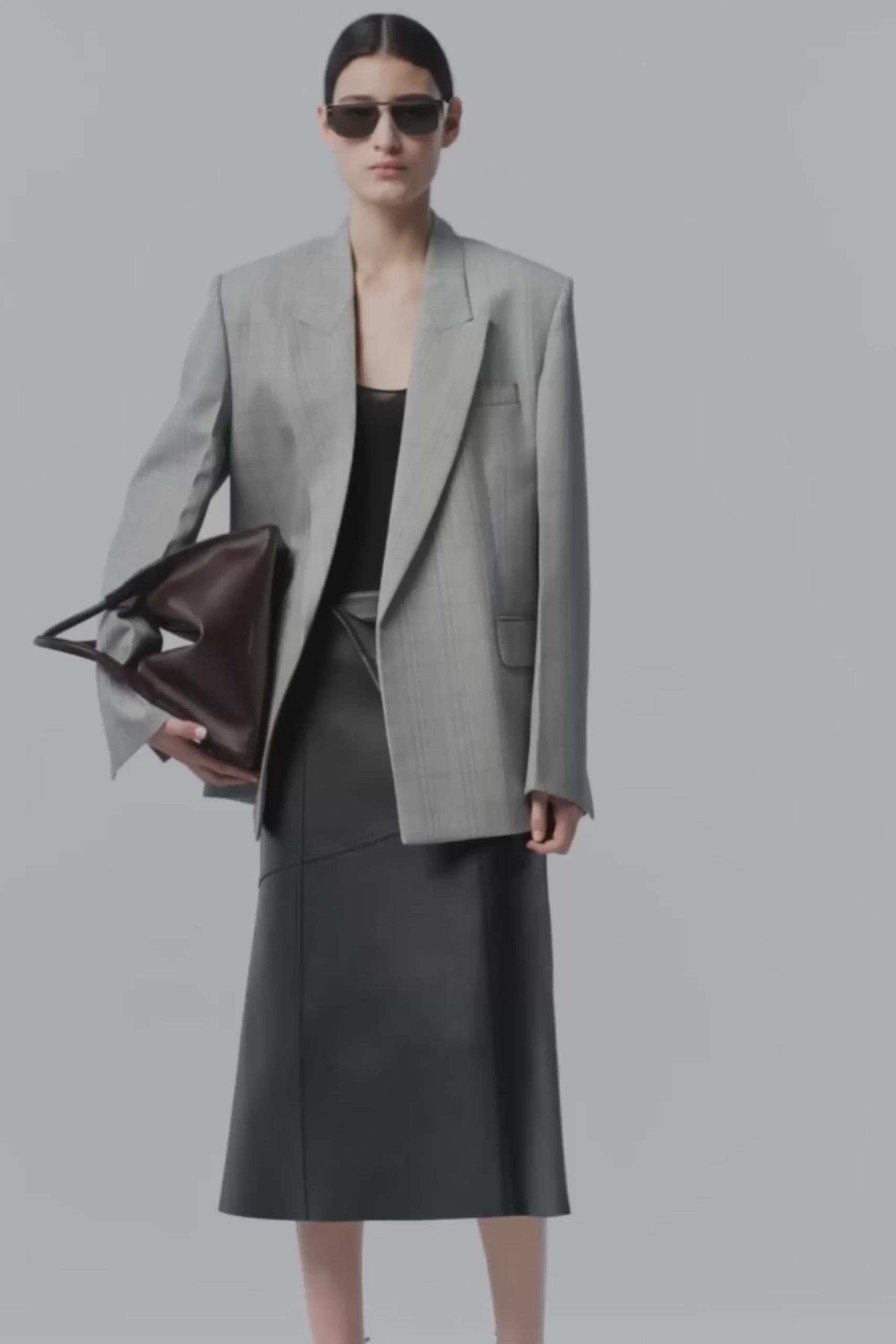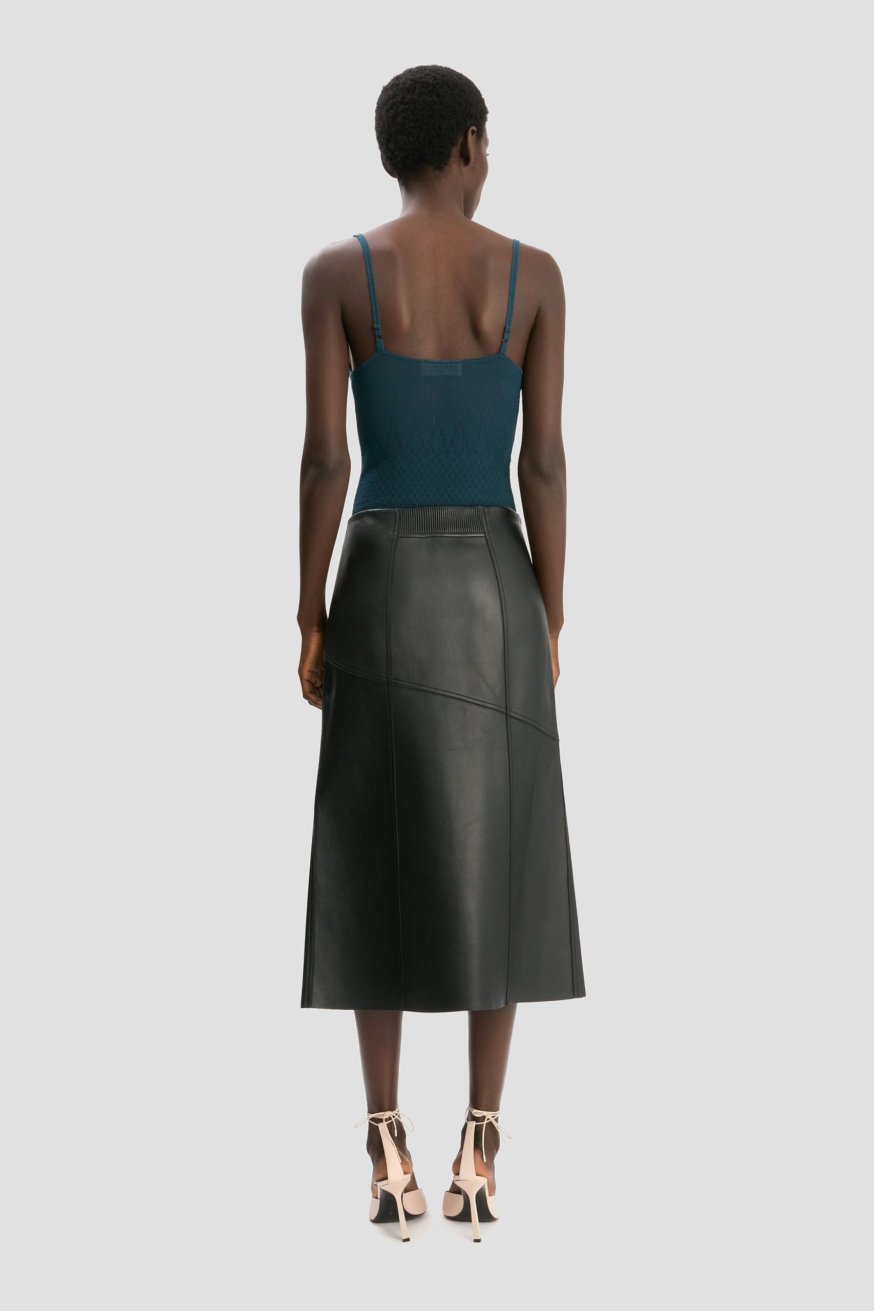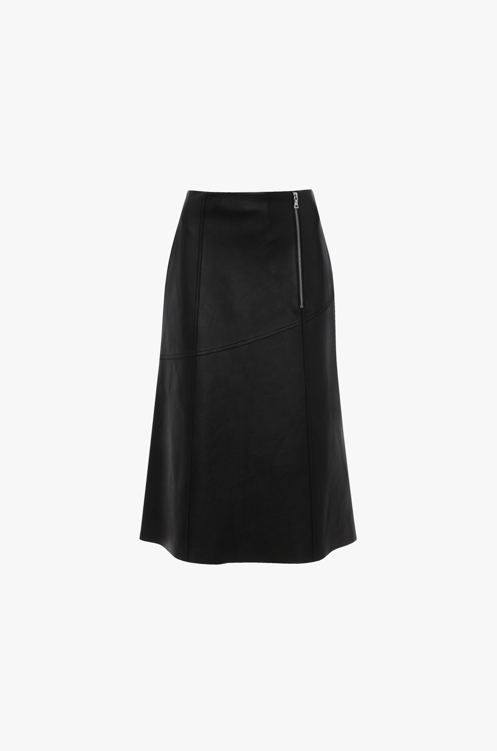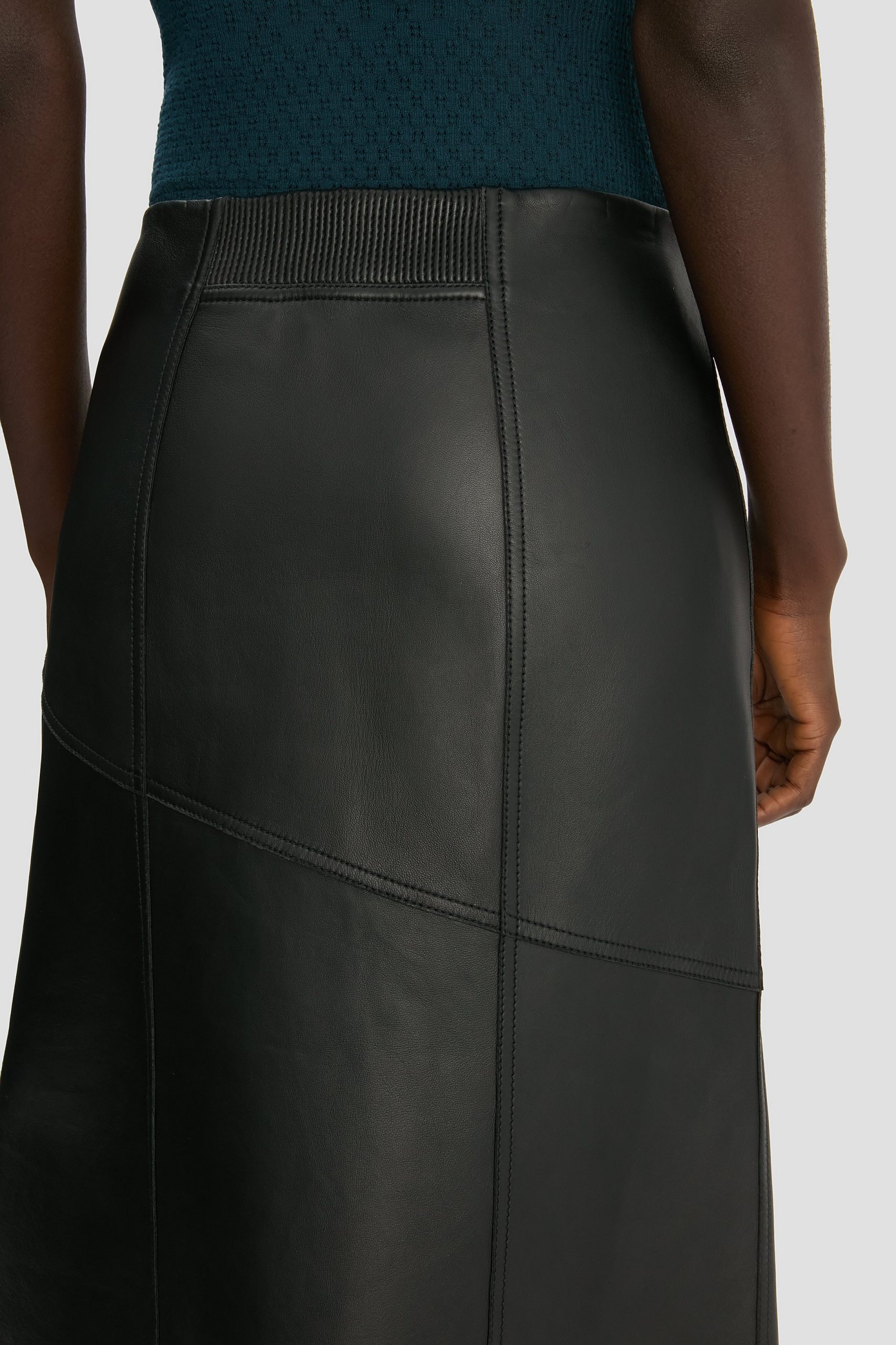 Supple nappa leather brings a sensuous undertone to this midi skirt in classic Black. Tactile talking points include a raw hem edge, elasticated panel at the back of the waist and diagonal hip seams with tonal topstitching.