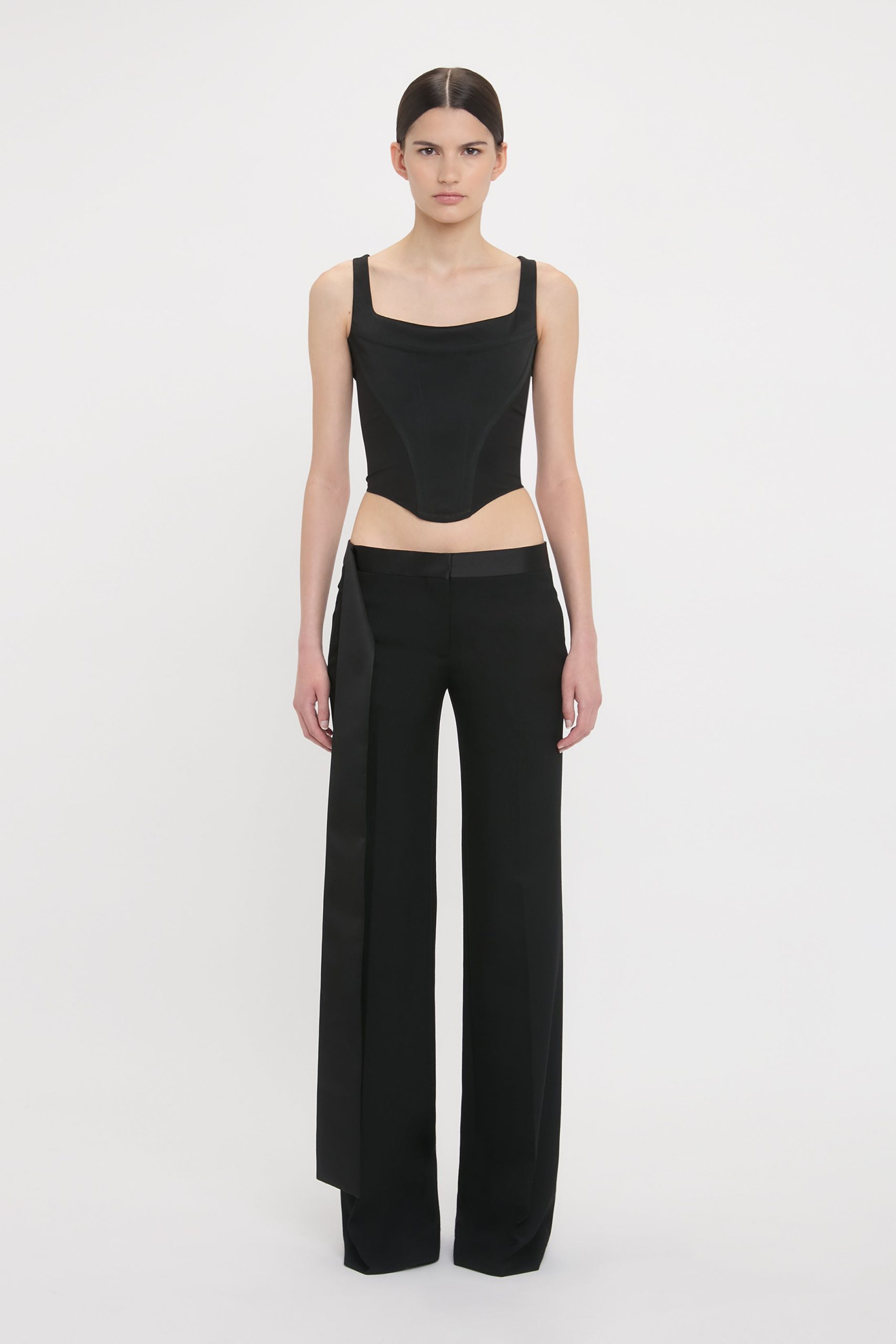 New to the Victoria Beckham tailoring edit, the Satin Waistband Trouser in Black marries masculine and feminine beautifully. Immaculately tailored with a contrasting satin waistband resonant of tuxedo style, the Satin Waistband Trouser is imbued with an elegant satin side tie that falls flamboyantly to midi length.