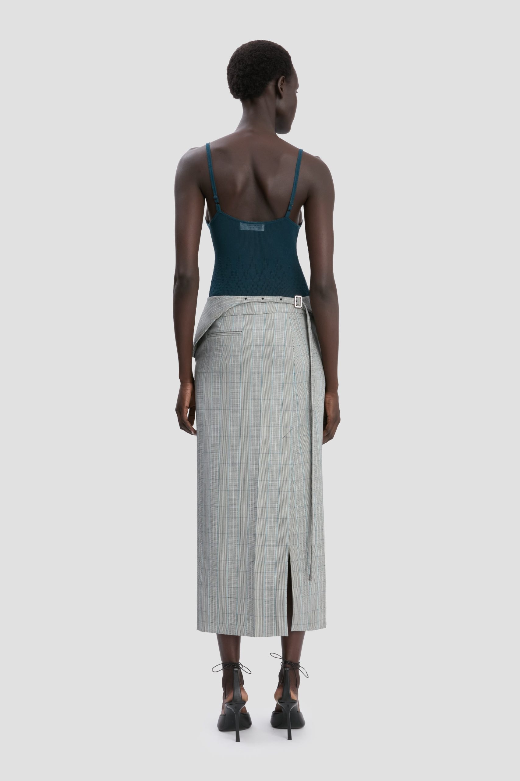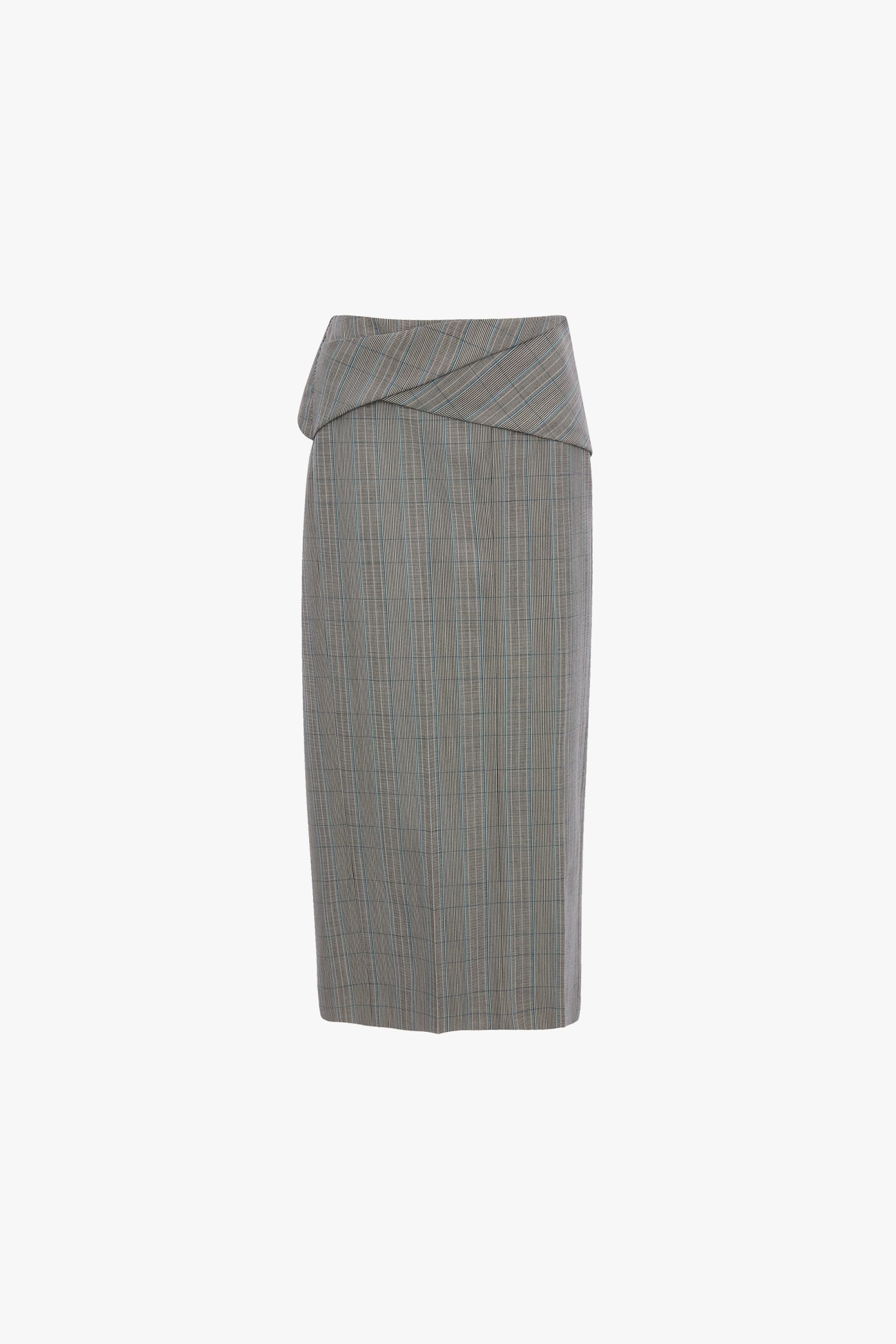 Crafted in Blue-Grey Check, the Wrap Skirt has a smart silhouette elevated with a faux wrap detail at the front. A back belt ensures a neat fit, while back welt pockets add a practical and attractive design detail.